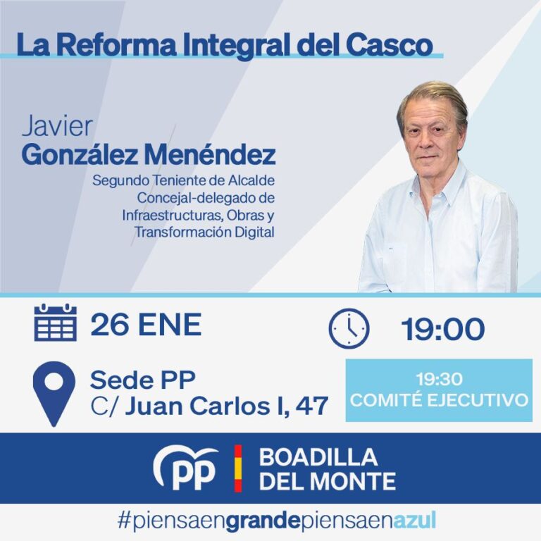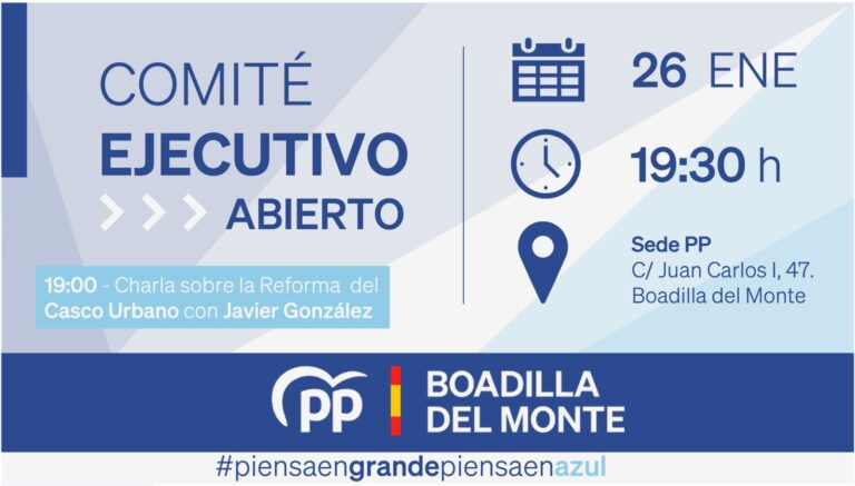 El próximo martes 18 de enero, a las 19:30h celebraremos el Comité Ejecutivo del Partido Popular de Boadilla del Monte.