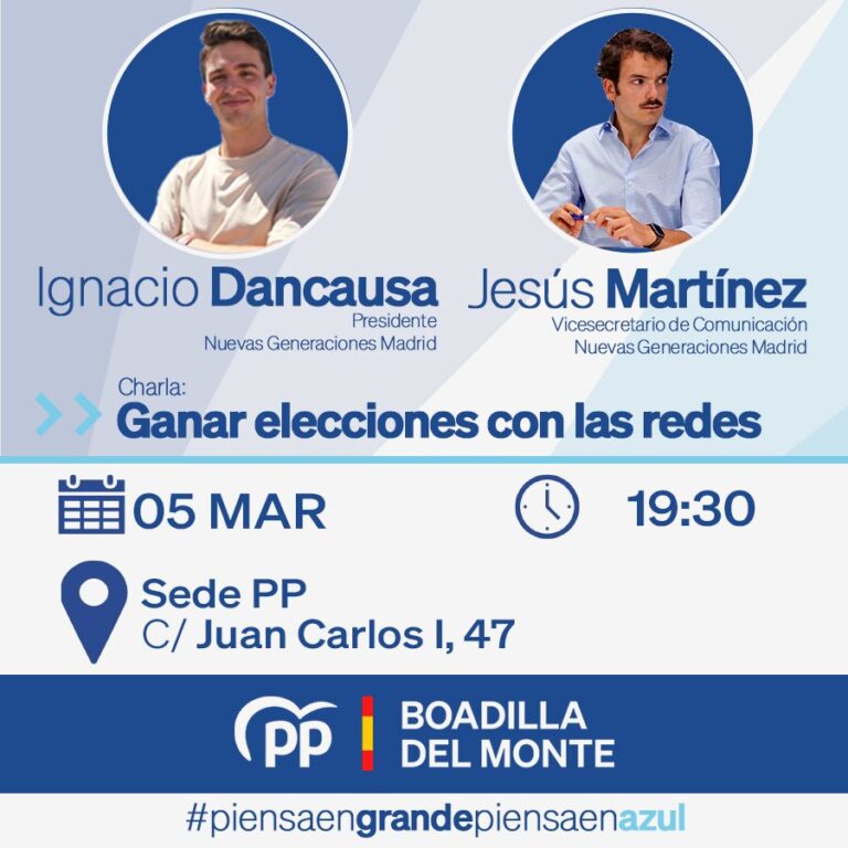El próximo jueves 5 de marzo, a las 19:30 h, contaremos en nuestra sede con Ignacio Dancausa, presidente de Nuevas Generaciones Madrid, y Jesús Martínez, vicesecretario de Comunicación de Nuevas Generaciones Madrid.