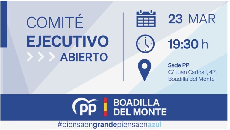 A las 20.00 tendrá lugar el Comité Ejecutivo del Partido Popular de Boadilla, en el que contaremos con la intervención de Alfonso Serrano, Secretario General del PP de Madrid.